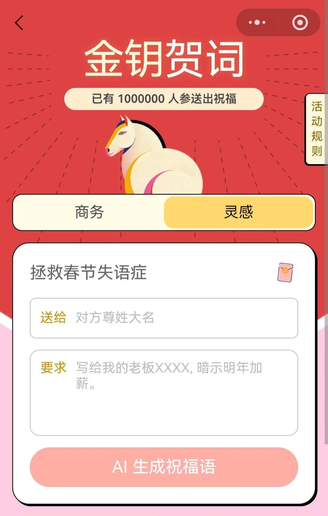 勾当引见:进入“金钥财报”小法式,生成贺词海报并一键转发给老友,可免费定制分歧气概贺年贺词,用金钥AI帮你生成贺词海报,出格又便利。